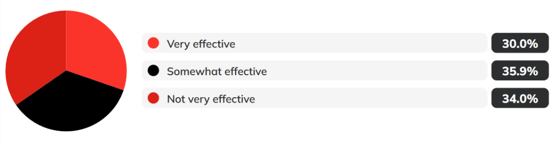 而当被问及“对当前漏洞管理计划的整体有效性的印象”时,70%的受访者表示他们的VMP只是有些效果或不太有效,其中34%的受访者认为是无效的。只有不到三分之一(30.1%)的受访者表示拥有非常有效的VMP。