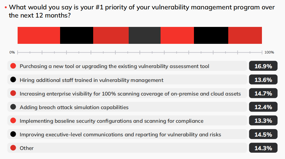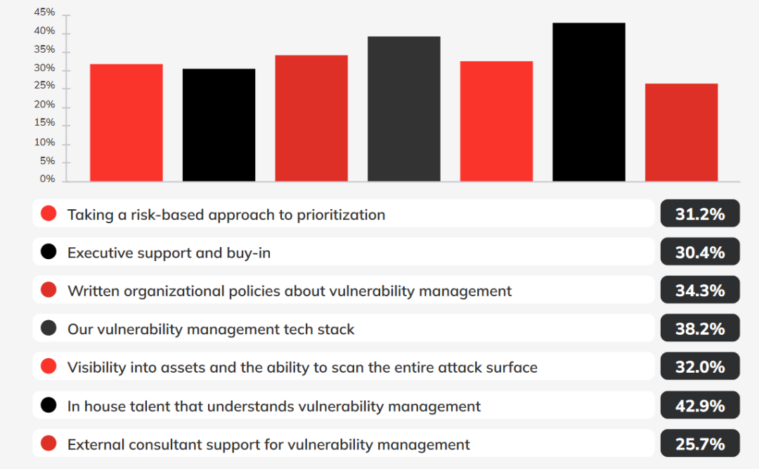 16.9%的受访者表示,其所在的企业将会购买新工具或升级他们现有的漏洞评估工具;14.7%的受访者表示需要提高企业的安全风险可见性,实现100%的本地和云上资产漏洞扫描覆盖率;14.5%的受访者表示要改进漏洞管理制度中的沟通和报告流程;13.6%的受访者表示要雇用更多受过漏洞管理培训的员工;13.3%要实施基线安全配置并扫描合规性;12.4%的受访者则表示要添加攻击模拟的功能。