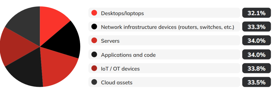 那么,安全团队目前正在执行什么类型的漏洞扫描呢?结果几乎平分秋色,受访者表示服务器、应用程序和代码是他们扫描最多的内容(各占34%)。另外33.8%为物联网和OT设备;33.5%为云资产;33.3%为网络基础设施设备(如路由、交换机等);32.1%为台式机/笔记本电脑。