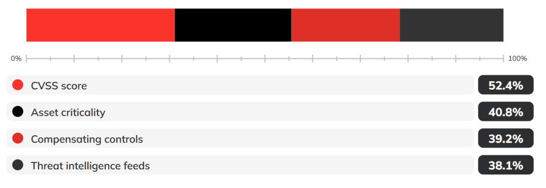 57.5%的受访者表示,他们的公司没有使用基于风险的评级系统来确定漏洞的优先级。因此可以这样认为,多数公司仍然是以“先识别、先修复”的方式来进行漏洞修复工作。而对于那些评估漏洞风险等级的企业,他们所依据的评估工具包括:52.4%为CVSS评分;40.8%为资产重要性;39.2%为补偿控制;38.1%为威胁情报源。