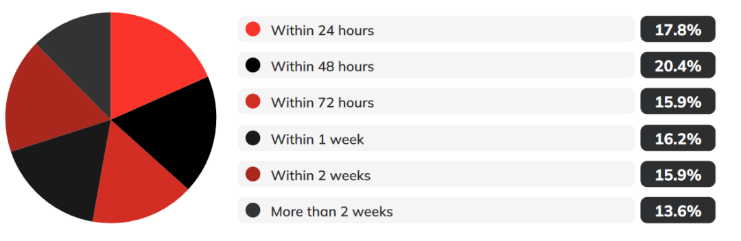 而在这些明确修复漏洞速度的企业中,20.4%的企业表示,他们要求在发现关键漏洞后48小时内对其进行修补;15.9%的企业在72小时内修复;16.2%的企业在1周内修复;15.9%的企业在2周内修复。只有17.8%的企业表示这些CVSS评分9.0及以上的高危漏洞需要在发现后的24小时内进行修复。