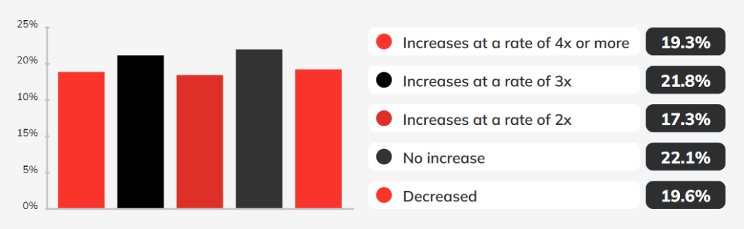 报告研究发现,在过去12个月中,跟踪漏洞数量的公司中有58%的报告称漏洞数量翻了一番、三倍或四倍。其中,17.3%报告翻了一番;21.8%报告翻了三倍;19.3%报告翻了四倍。只有22.2%的报告称漏洞数量没有增加,19.6%的报告称观察的漏洞数量减少了。