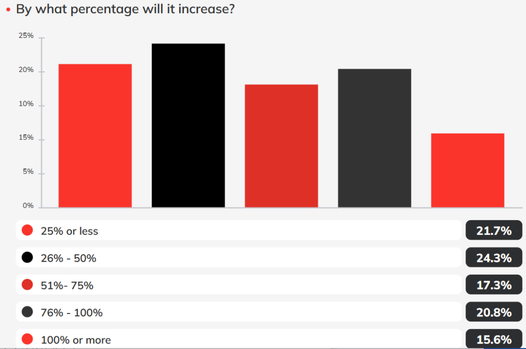 24.4%的受访者预计漏洞管理预算会呈现26%至50%的适度增长,只有21.7%的人预计会低于这个水平(25%及以下)。此外,17.3%的人乐观地认为预算会增长51%-75%;20.8%的人认为预算会增长76%-100%;甚至15.7%的人期待预算增加100%或更多。