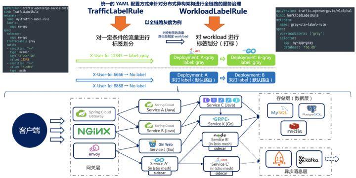 http://traffic.opensergo.io/label: gray ,这样框架向 Nacos 注册该节点时会为其添加一个 gray 标签。对于一些复杂的 workload 打标场景(如数据库实例、缓存实例标签),我们可以利用 WorkloadLabelRule CRD 进行打标。示例: