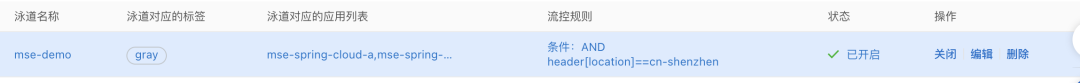- condition: "==" # 匹配表达式 type: header # 匹配属性类型 key: location # 参数名 value: cn-shenzhen # 参数值1.2.3.4.5.6.7.8.9.10.11.12.13.14.15.通过上述配置,location header 为 cn-shenzhen 的 HTTP 流量,打上 gray 标,代表这个流量为灰度流量。