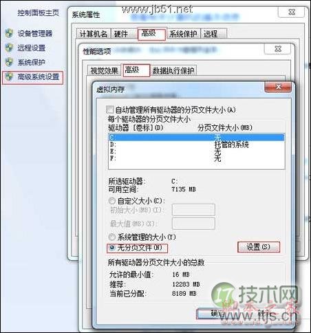 相比休眠文件,虚拟内存也是占用C盘空间的大户,Windows 7默认设置的虚拟内存是在C盘,这个时候,我们只需要把虚拟内存转移到D盘就可腾出C盘的空间。右键点击计算机属性—高级系统设置—系统属性高级—性能选项高级—虚拟内存,将C盘设置成无分页文件,点击同行的设置,假如想关闭虚拟内存这样设置即可,假如想转移到D盘,点击D盘,设置D盘虚拟空间大小即可。
