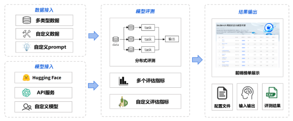 SecBench网络安全评测框架可以分为数据接入、模型接入、模型评测、结果输出四个部分,通过配置文件配置数据源、评测模型、评估指标,即可快速输出模型评测结果。