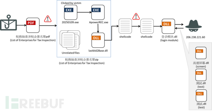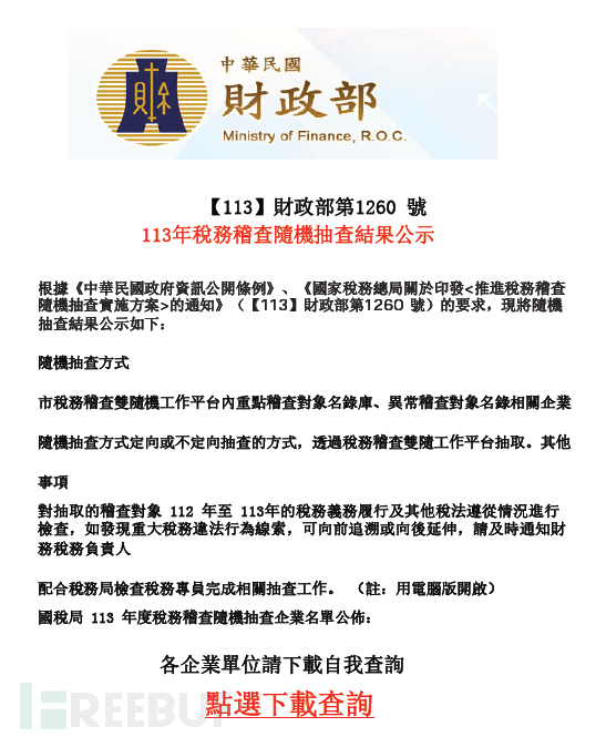 进一步调查显示,税务该恶意软件专门针对Microsoft Windows平台展开攻击。恶意攻击者精心设计了一封伪装成台湾国家税务局的软件钓鱼邮件,作为初始攻击媒介。黑客该邮件谎称包含即将接受税务检查的公司名单,并要求收件人将信息转发给财务部门。邮件附件伪装成财政部的正式文件,实际包含一个用于下一攻击阶段的恶意DLL文件。