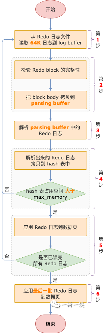 1 ~ 5 步是个循环执行过程,经过 N 轮循环之后,hash 表中有非常大的可能性还存在着最后一批 Redo 日志,因为占用空间小于等于 max_memory 而只能在那里苦苦等待着被应用到 Redo 日志,这个工作就要等待第 6 步去干了。