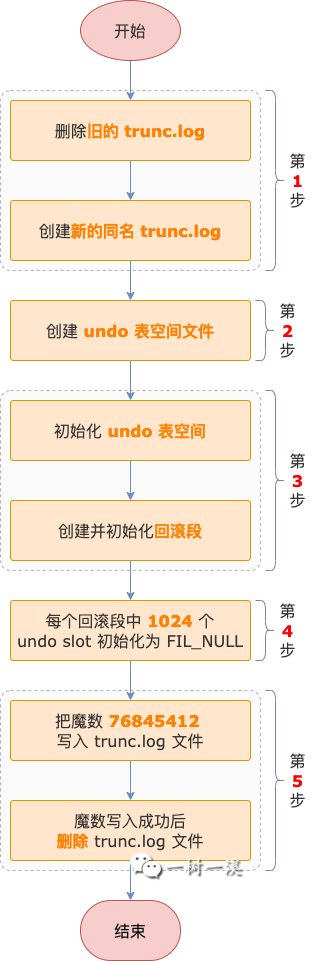 写入魔数成功之后,再把 trunc.log 文件删除,重建一个 undo 表空间的过程就结束了。