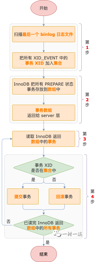 3 ~ 4 步是个循环过程,循环完 InnoDB 返回的 PREPARE 事务数组之后,处理 PREPARE 事务的过程结束,崩溃恢复主要流程也就完成了。