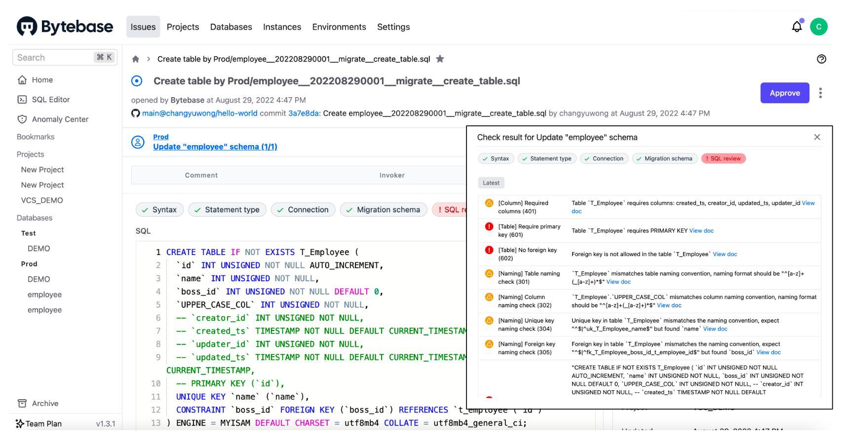 用于数据库 CI/CD 的 SQL 更改推出工具应该能够与 VCS 集成。一旦您的 SQL 脚本经过审查并合并到目标分支中,就会触发发布过程,并且脚本会自动推送到 Bytebase。当然,DBA 可以在针对目标数据库执行 SQL 之前执行另一次完整性检查。
