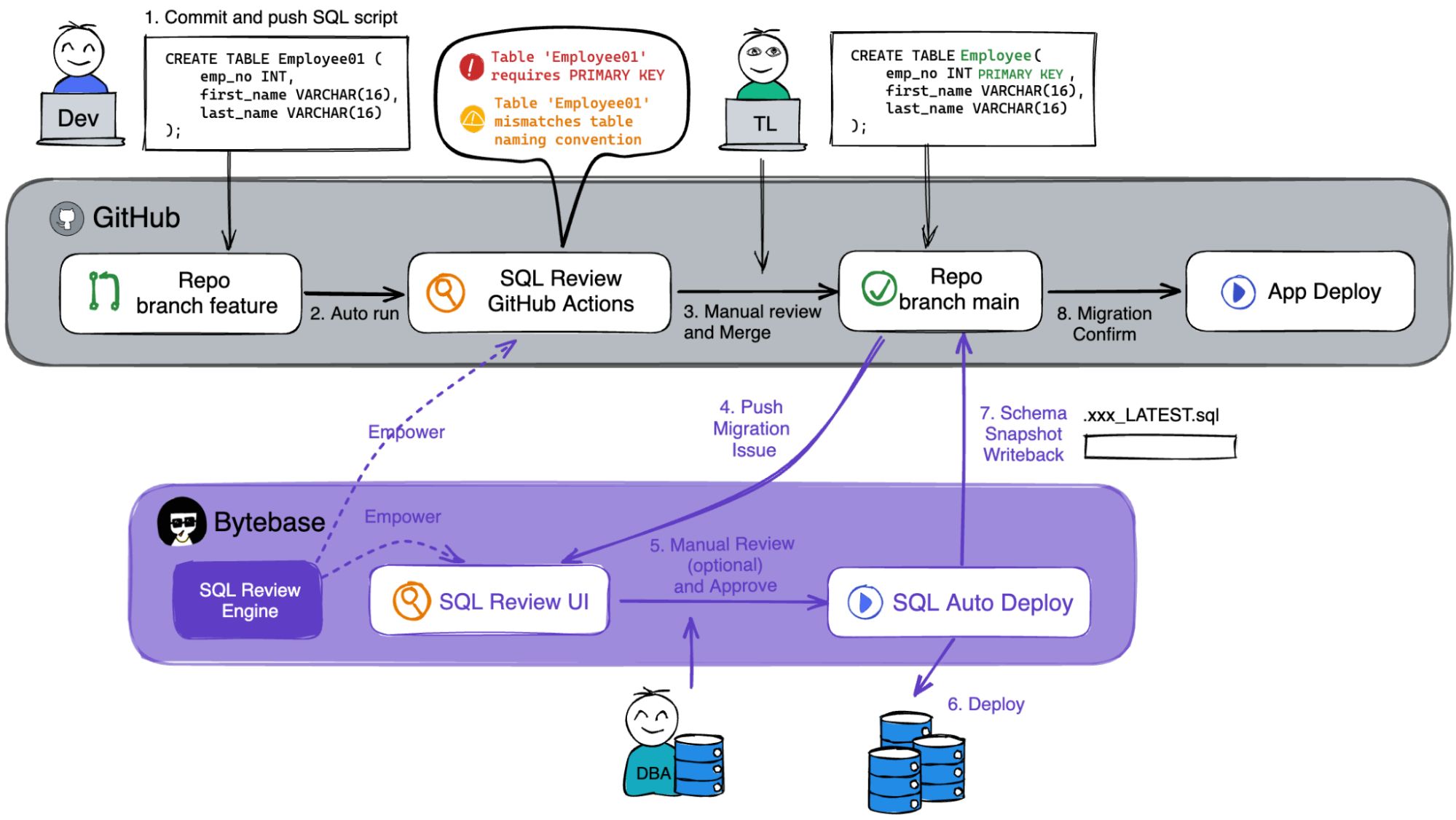 我们需要一个更高效和自动化的发布流程。让我们回顾一下应用程序代码的经典 CI/CD 工作流程:提交更改 > 代码审查 > 合并分支 > 自动构建 > 自动部署。既然我们已经在 GitHub Actions 上实现了 SQL 审查,为什么不能包括后续的推出流程呢?