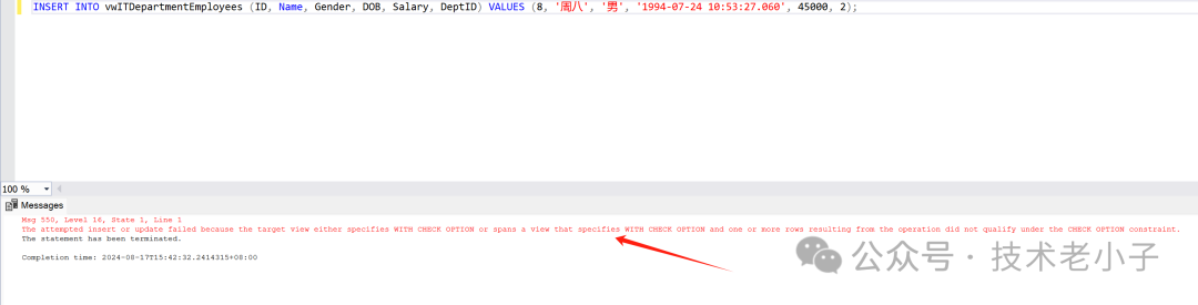 现在,尝试执行之前的INSERT语句将会失败,因为它违反了视图的WHERE条件。