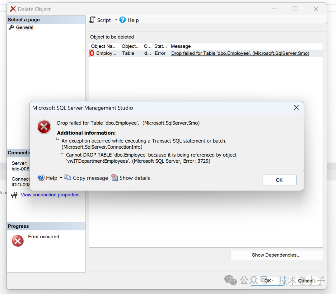复制ALTER VIEW vwITDepartmentEmployees WITH SCHEMABINDING AS SELECT ID, Name, Gender, DOB, Salary, DeptID FROM dbo.Employee WHERE DeptID = 1 WITH CHECK OPTION;1.2.3.4.5.尝试删除或修改Employee表将导致错误,因为它被视图引用。