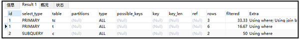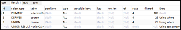 复制explain select cr.cnamefrom ( select * from course where tid = 1 union select * from course where tid = 2 ) cr ;1.2.结果如下: