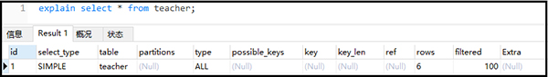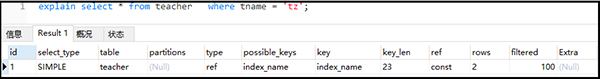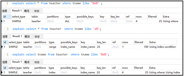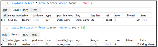 ⑦ 尽量不要使用类型转换(显示、隐式),否则索引失效 复制explain select * from teacher where tname = abc ;explain select * from teacher where tname = 123 ;1.2.结果如下: