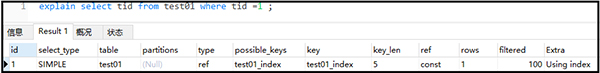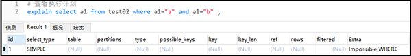 explain select a1 from test02 where a1="a" and a1="b" ;1.2.结果如下: