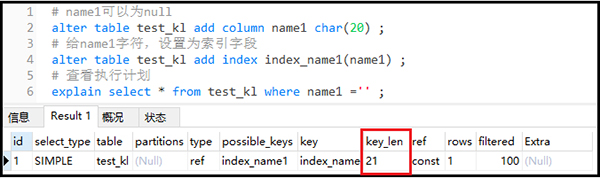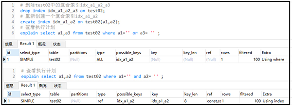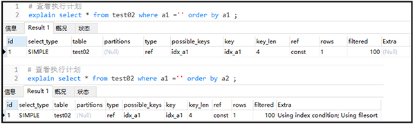 explain select a1,a3 from test02 where a1="" and a3="" ;1.2.3.4.5.6.结果如下: