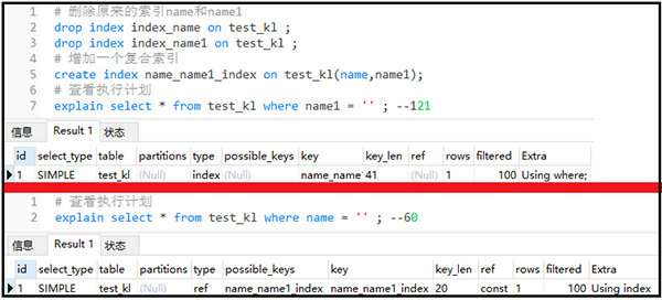 结果分析: 我们创建了两个索引,但是实际上只使用了一个索引。因为对于两个单独的索引,程序觉得只用一个索引就够了,不需要使用两个。