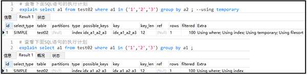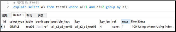 explain select a3 from test03 where a1=1 and a3=2 group by a3;1.2.结果如下: