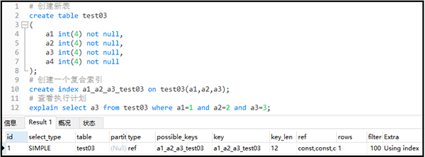 explain select a3 from test03 where a3=1 and a2=2 and a1=3;1.2.结果如下: