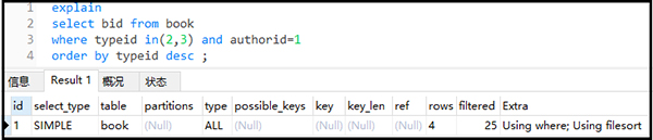 explain select * from book where authorid = 1 and typeid =2 ;1.2.结果如下: