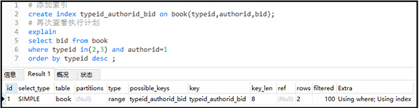 alter table book add index idx_book_at (authorid,typeid);# 查看执行计划