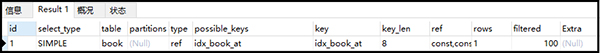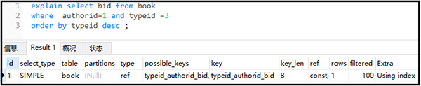 explain select * from book where authorid = 1 and typeid =2 ;1.2.3.4.5.6.7.结果如下:
