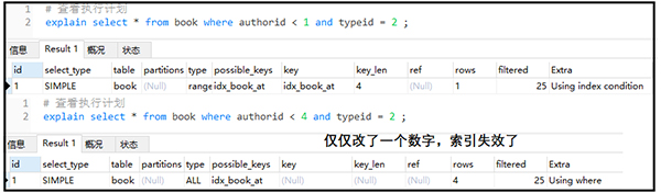 explain select * from book where authorid > 1 and typeid = 2 ;explain select * from book where authorid = 1 and typeid > 2 ;1.2.3.4.5.6.7.8.结果如下:
