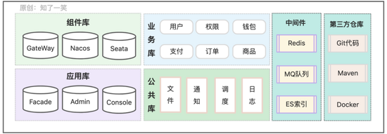 第三方:大部分系统都或多或少的依赖一些第三方仓库,比如Git代码仓库、Maven包仓库、Docker镜像仓库、行为埋点数据、云服务器提供商OSS文件服务等;