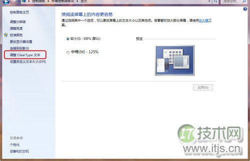 在设置ClearType 之前,再说说这个“个性化”,可能很多人都知道,在这里可以设置桌面主题和壁纸,却忽略了其它功能,比如在“显示”里还为我们提供了诸如字体大小,显示亮度,显示分辨率等调节,通过这些细节上的修改同样可以提升整机的显示效果,保护我们的双眼,大家可以根据自己的需要进行修改和调节。看屏幕的左边栏(见下图),这里有一个“调整ClearType文本”,“Clear”技术的相关设置就在这里进行了。单击它,系统自动进入详细设置界面。