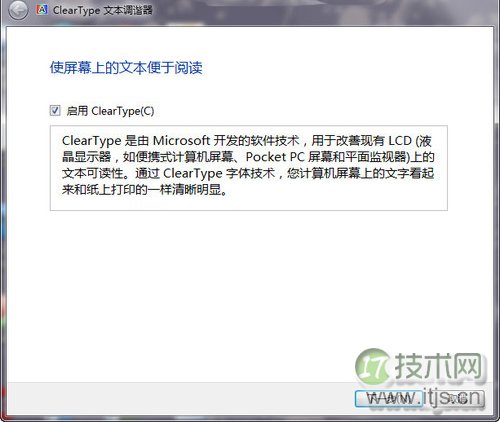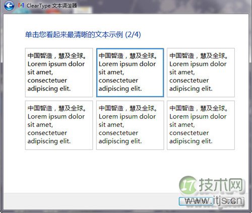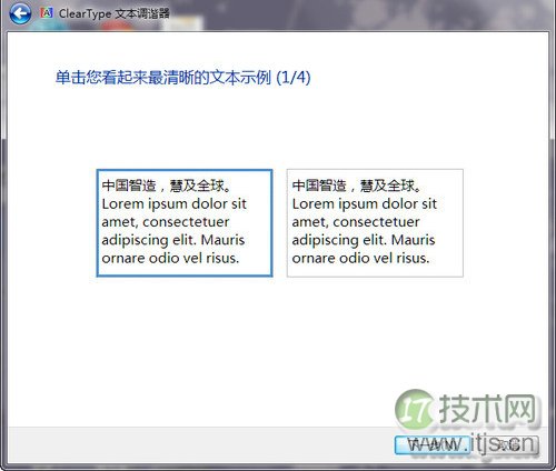 在这里,我们需要点击“下一步”,共有4步帮助你完成ClearType 设置,只要选择自己认为哪个是最清晰的字体。通过几步,原来看上去显示效果很差的显示器,是不是已经很清晰了,至少它会适用于你的眼睛,不会太疲劳。